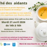 Publiée le 01/04/2026Bonjour, L'association A3 d'aide aux aidants vous accueille le 21 avril de 14h à 16h, autour de leur "Thé des aidants", dans les locaux de l'EHPAD La Carrairade, Rue du Deven 13740 Le Rove. Un parking est accessible et disponible. L'association A3 vous attend, que vous ayez un proche &agrav [...] Lire la suite